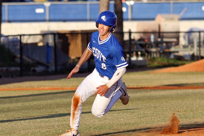 Ben Burke races home to score the winning run. *Photo from @JesuitHighSchoolBaseball-Tampa.