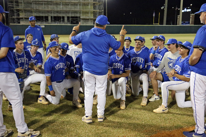 Jesuit Manager Miguel Menendez addresses the team following the big victory. *Photo from @JesuitHighSchoolBaseball-Tampa.